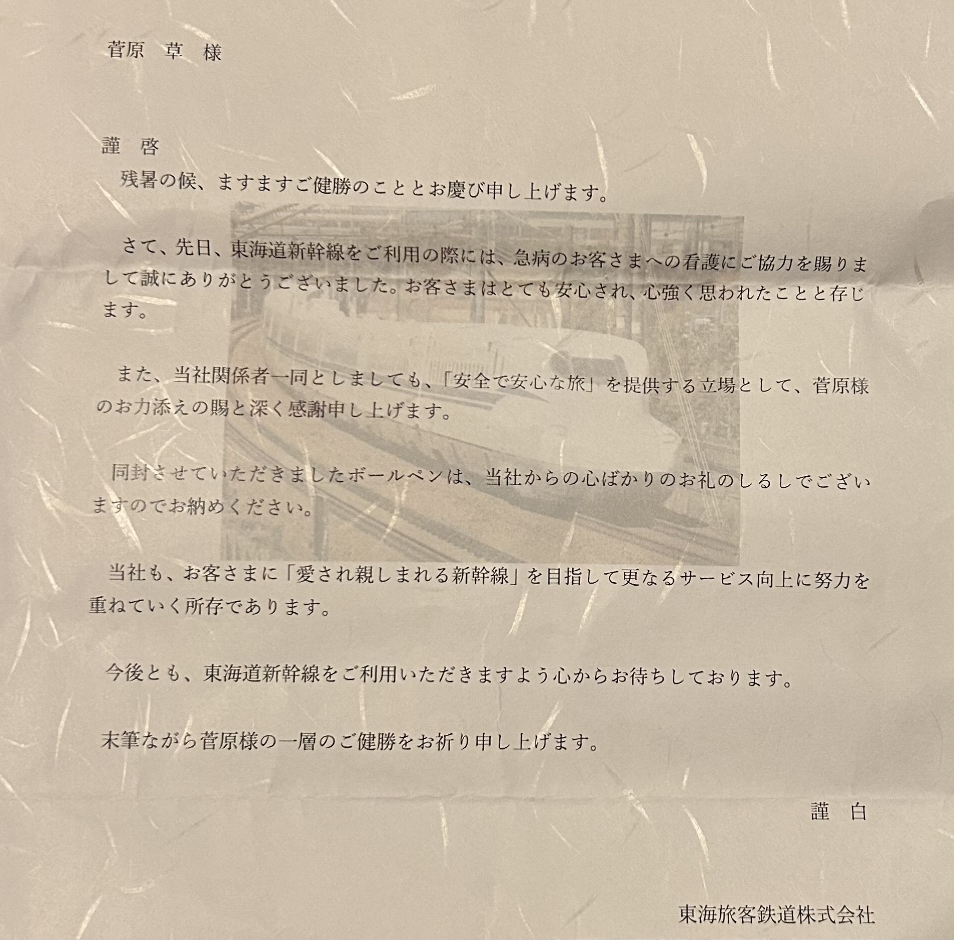 で、後日、JR東海が印字されたボールペンが自宅に送られてきました。名前と住所を確認するのって、もちろん謝礼を渡したいという事以外に、ほんとにこいつは医者なのか?なりすましとかではないのか?を検索し、確認するためのものでもありますよね?きっと、、、。何せ、こっちは短パンとTシャツでしたからね・・・。