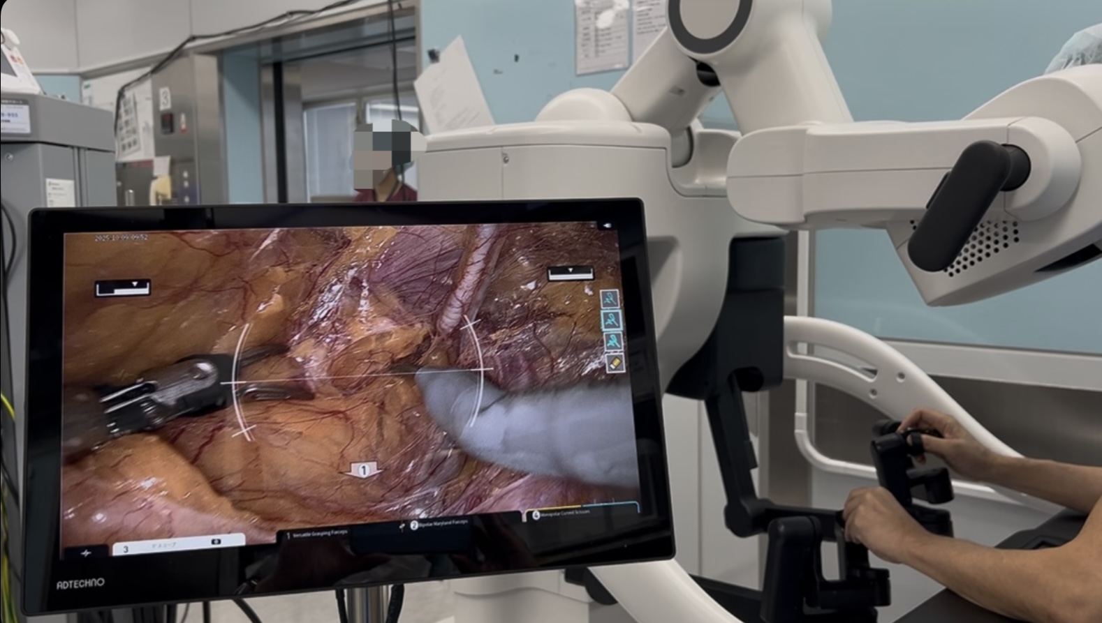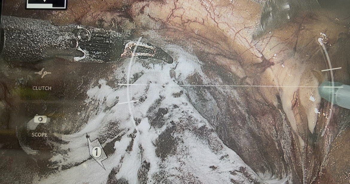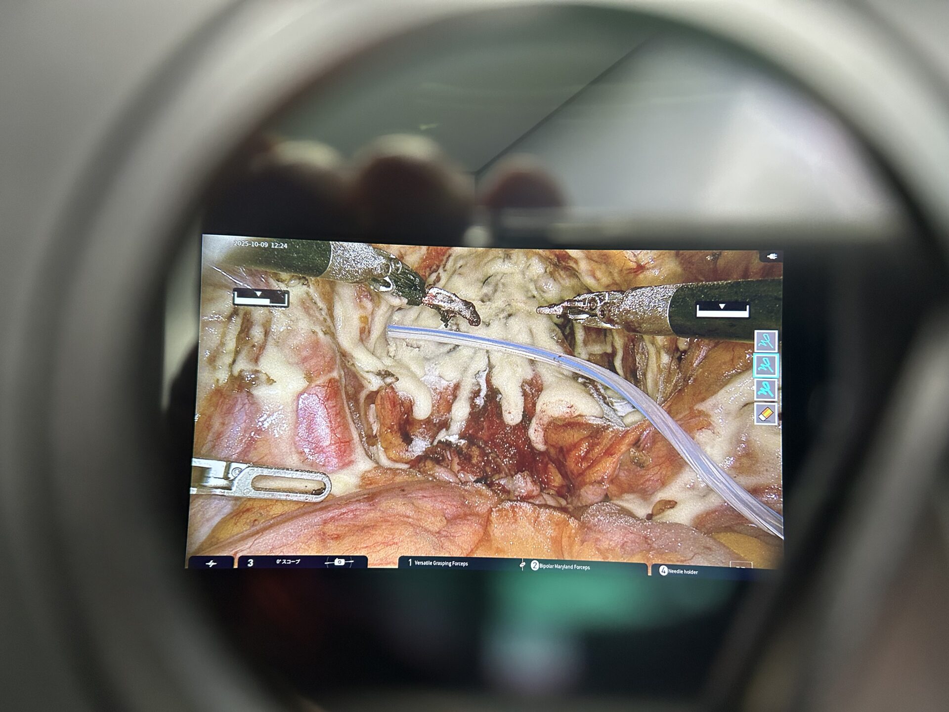 実際にope室に入るとすでに麻酔の導入は終わっており、頭低位(約25度)の体位変換をし、創部の消毒をして手術が開始されました。まずは、カメラポートを臍部に立てて、そこから鉗子を通すポートが3か所立てられて、やっと本丸の執刀開始です。ポートを立てる際には清潔操作ですが、実際のロボット手術は術野から離れた場所にあるサージオンコンソール(コックピッド)と言われる部分で椅子に座り、3D画面に向かって術者が操作するため清潔操作の必要が無くなります。ガウンテクニックと手袋を外して通常のスクラブのオペ着と素手でロボットの操作が始まります。左手はバイポーラー(止血凝固用鉗子)、右手はモノポーラー(カット&止血)鉗子を操ります。フットペダルで画面の切り替え(角度、拡大、縮小、遠近調整etc)を担います。
