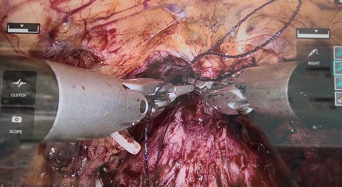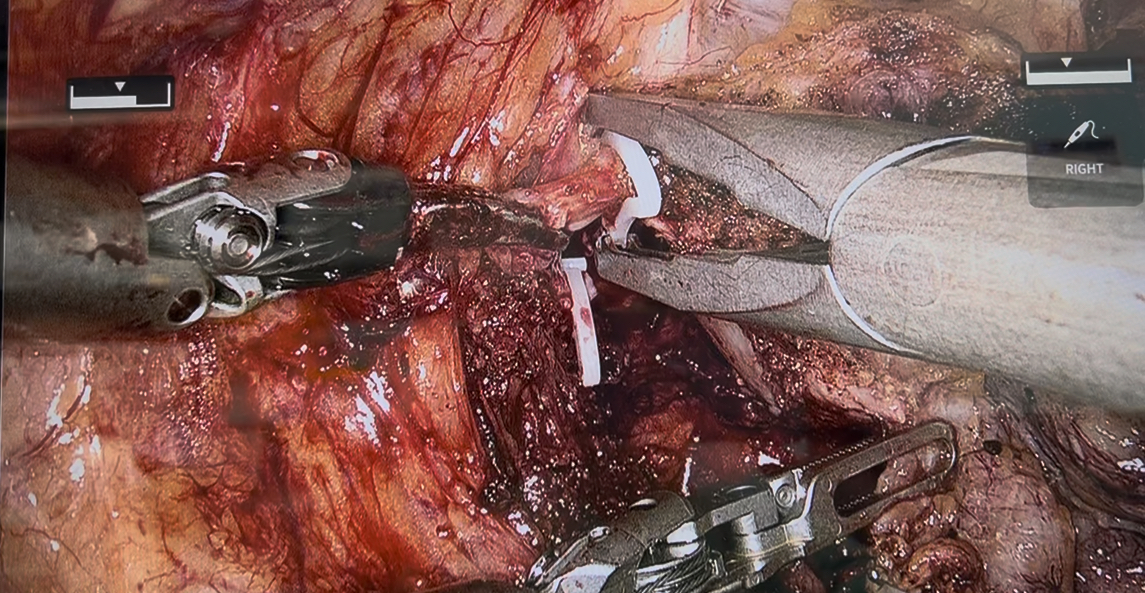 DVC切断後にV-Loc縫合糸にて切除断端を連続縫合し、止血しているところ。