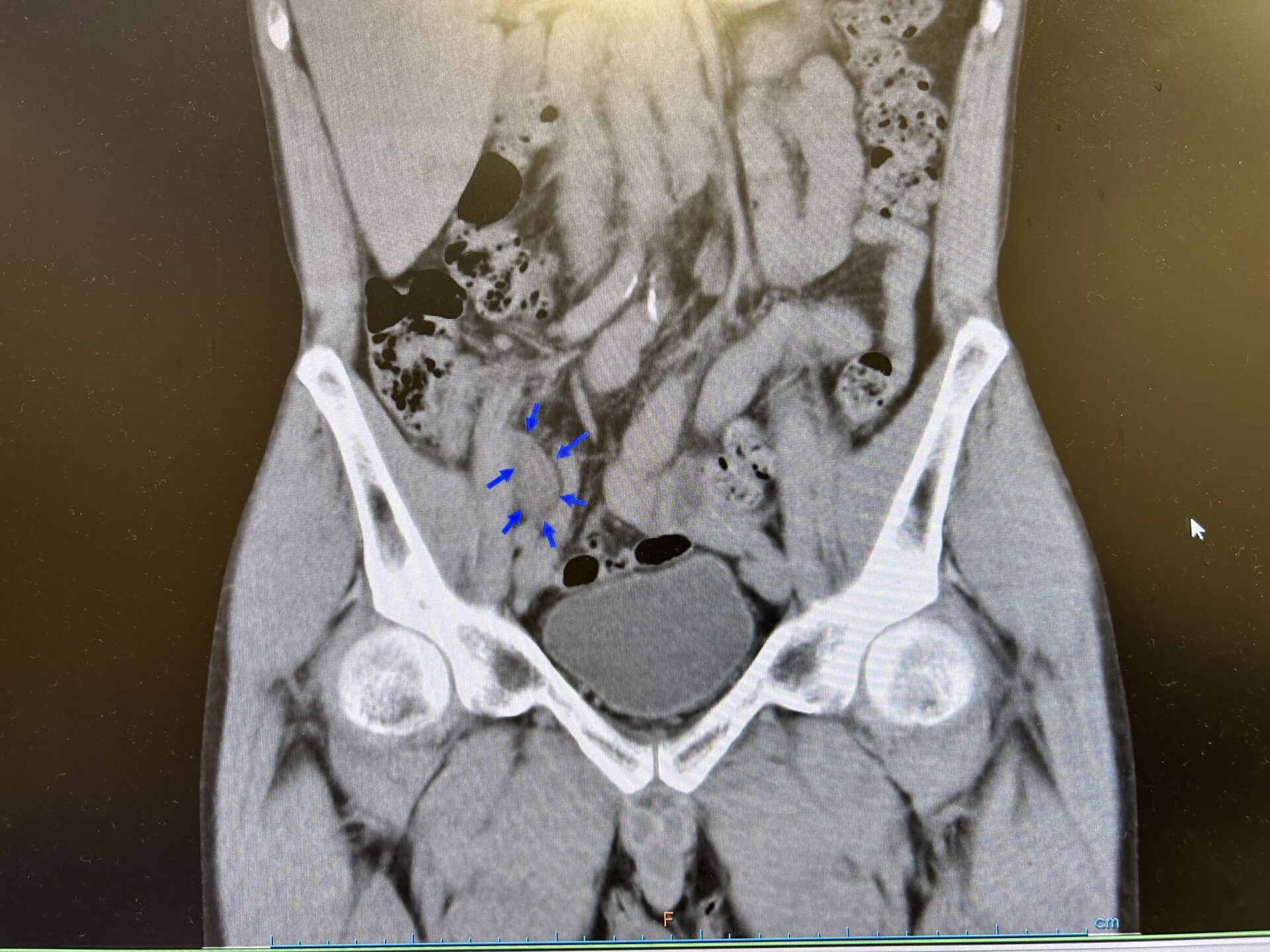 【緊急CT冠状断像:右下腹部に腫大した虫垂を認めている】