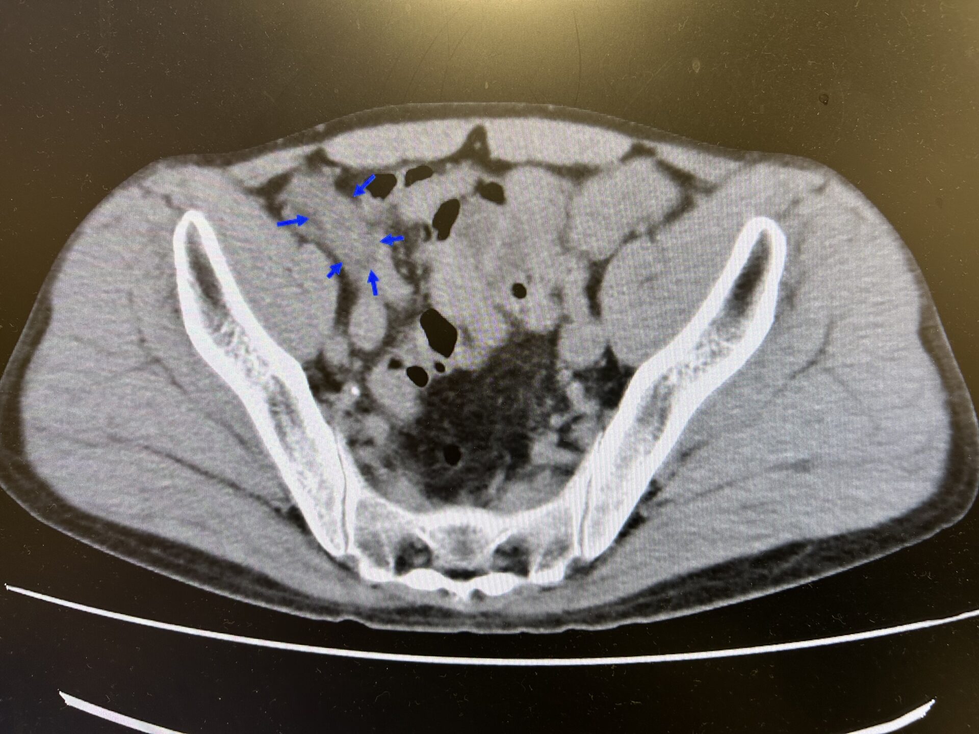 先ほどエコーで認められた虫垂の腫れた部位がやはりCT上でも同様の所見を認め、急性虫垂炎の診断が返ってきました。その後、患者さんには専門家に今後についてしっかりとコンサルトしましょうと説明し、近隣施設の消化器外科に緊急で紹介受診とさせていただきました。