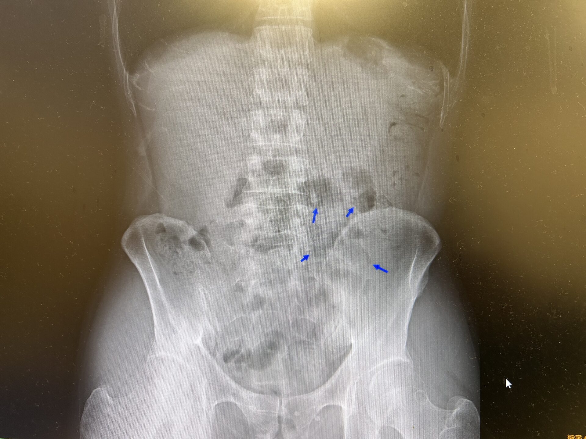 すると、緊急採血の結果はWBC9080↑(正常値300-9000)CRP1.40↑(正常値<0.3)と軽度炎症反応の上昇あり。また、レントゲン上では二ボー像は無かったものの、小腸ガスがところどころに認められており、腸蠕動が鈍くなるサインが出ていました。