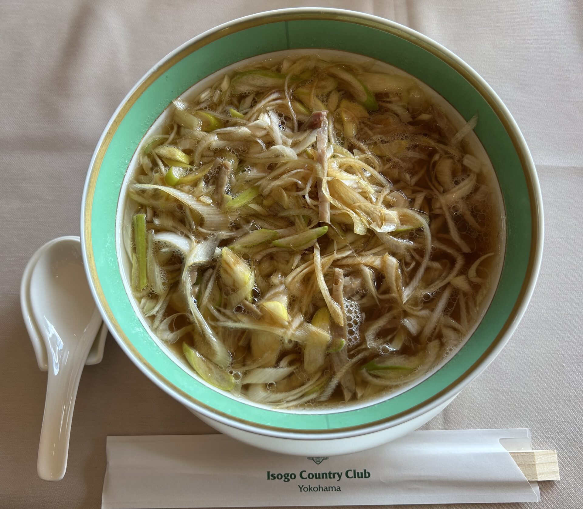 会場となった磯子カンツリークラブは中華がおいしいので有名です。お昼にはネギそばをいただきました。(ここは、中華に限らず、何を頂いても美味しいです。ゴルフ場選びの基準に昼食のランキングは重要です)