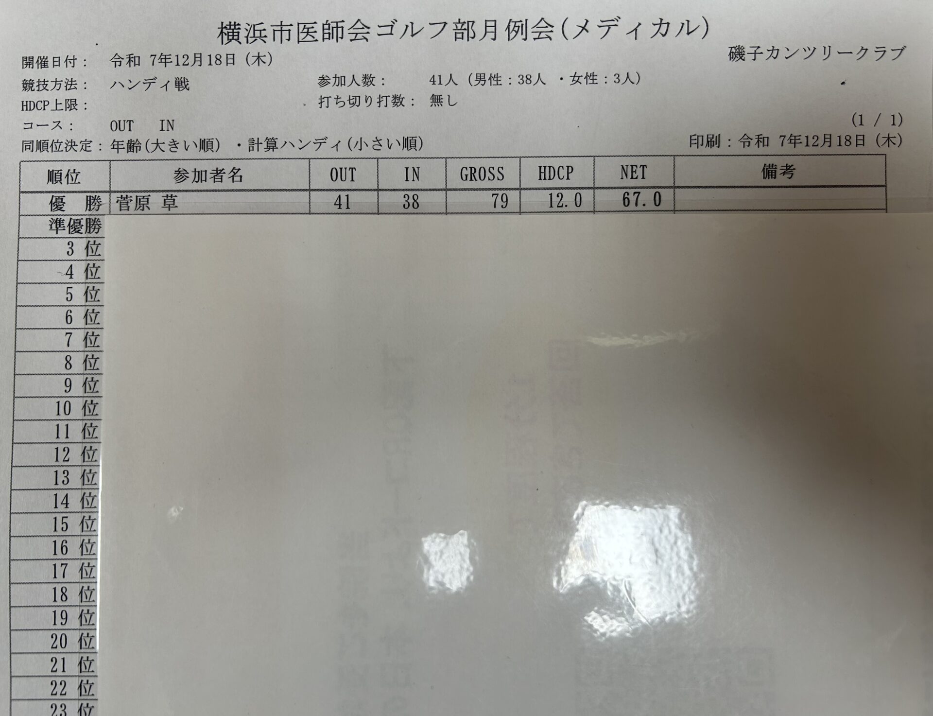 2025年12月18日横浜市医師会ゴルフ部定期月例会が磯子カンツリークラブで行われ、人生初の70台を達成し、初優勝を飾りました! 2025年12月18日横浜市医師会ゴルフ部定期月例会が磯子カンツリークラブで行われ、人生初の70台を達成し、初優勝を飾りました!