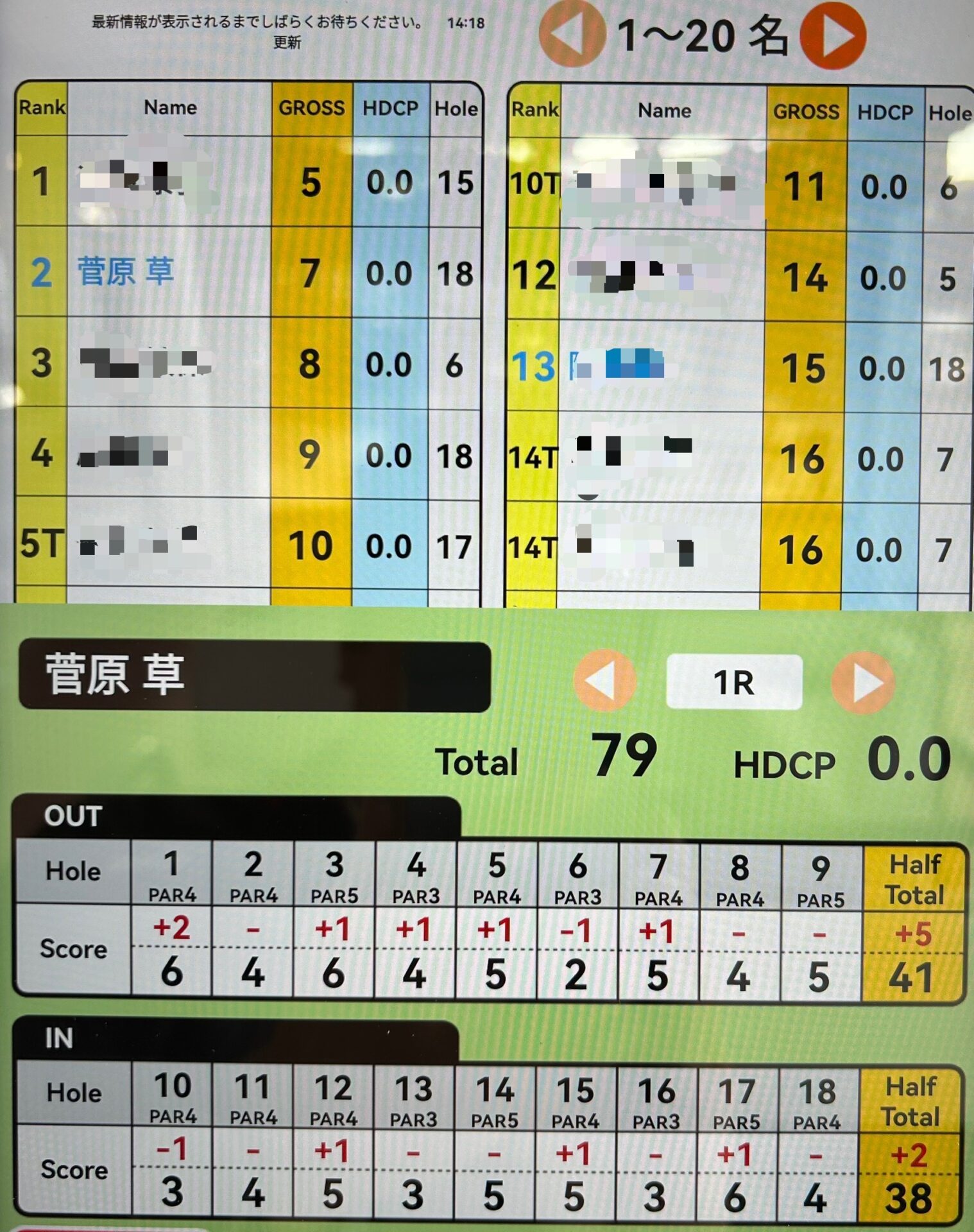 途中ナビ上で見られる全選手のスコアボードを同伴競技者の先生方と覗きながら、残り3ホールの時点でトップの先生は5オーバーで、続く私ともう一方同ハンデの先生が2打差の7オーバーで続きました。結局後半は今季初の2オーバーの30台が出て、念願の70台でフィニッシュすることが出来ました。