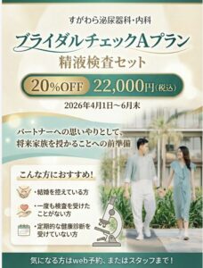 この度、2026年4月1日から6月末日まで、好評のブライダルチェックAプランと精液検査セット価格が通常価格の20% offの22,000円でご提供する事と致しました。